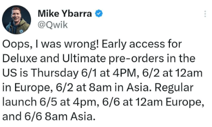 "Oups, je me suis trompé ! L'accès anticipé pour les précommandes Deluxe et Ultimate aux États-Unis sera le jeudi 1er juin à 16h, le 2 juin à minuit en Europe et le 2 juin à 8h du matin en Asie. Le lancement officiel pour tous les autres joueurs aura lieu le 5 juin à 16h aux États-Unis, le 6 juin à minuit en Europe et le 6 juin à 8h du matin en Asie."
