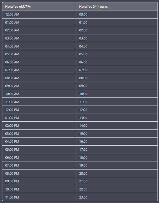 Pour mieux comprendre comment fonctionne les horaires aux US voici un tableau :