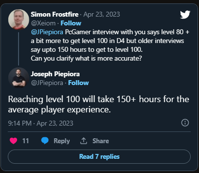 Selon le directeur de jeu associé, Joseph Piepiora, atteindre le niveau 100 dans Diablo 4 prendra plus de 150 heures pour le joueur moyen. Piepiora a clarifié la confusion sur différentes déclarations concernant le temps de jeu nécessaire pour atteindre le niveau 100 en s'exprimant sur Twitter.