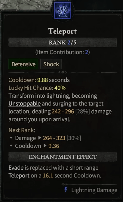 Le sort principal que nous allons utiliser dans ce build, vous l’aurez compris, c’est la Chaîne d’éclairs. Vous allez la booster autant que possible avec les bonus liés à ce sort qui augmenteront ses chances de coup critique de 3% par rebond et de +25% de dégâts après chaque rebond qui repasse par vous-même. Vous allez trouver également de nombreux légendaire pour booster cette compétence que nous allons voir plus bas !
