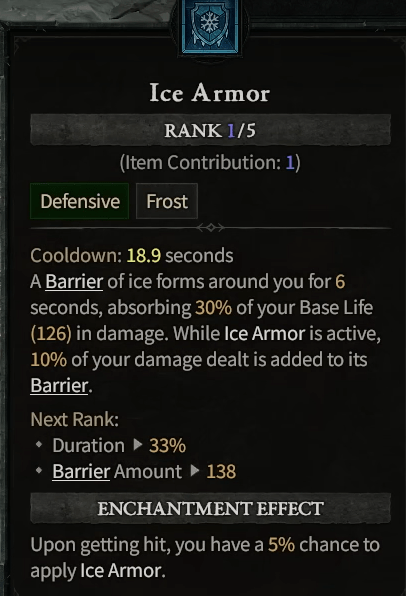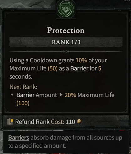 Vous avez également ce passif qui est très important car il va vous faire proc des barrières, ainsi que plein d’autres affixes légendaires qui vont augmenter vos dégâts en plus d’améliorer votre survie.