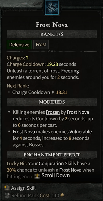Il utilise également la Nova de givre qui sera un bon sort défensif, mais qui, avec ses améliorations, va rendre toutes les cibles autour de vous “vulnérables”, ce qui augmentera les dégâts que vous leur infligez de 20%.