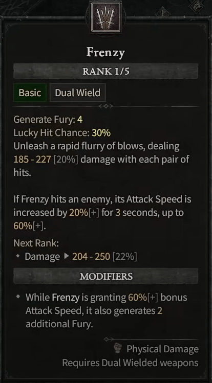 Pour commencer, pour les compétences de base, nous allons utiliser Frenzy, qui a l'avantage d'augmenter considérablement votre vitesse d'attaque et donc votre génération de fureur, tout en vous permettant de booster énormément les dégâts de la compétence principale du build : le Soulevement. Vous allez vite comprendre pourquoi. Nous allons utiliser ici seulement le premier modificateur qui vous donne 2 points de fureur en bonus une fois que vous atteignez +60% de vitesse d'attaque.
