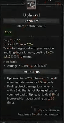 Ensuite, nous avons la compétence principale de ce build : le Soulevement, qui inflige de très gros dégâts de base. Vous allez donc vouloir investir le plus de points possible dans cette compétence.