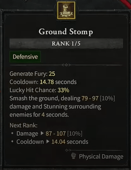 Au niveau suivant, nous allons prendre "Ground Stomp", qui va vous permettre d'avoir un contrôle minimum assuré pendant votre leveling. Nous allons prendre ses améliorations qui augmentent la durée de l'étourdissement de 1 seconde et qui génèrent 25 points de fureur.