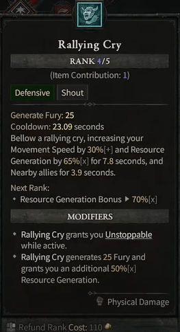 Le Cri de Ralliement est indispensable, car il vous donne de la mobilité et énormément de génération de fureur, ce qui s'accorde très bien avec votre sort de base "Frenzy", une fois de plus et boost également vos allier.