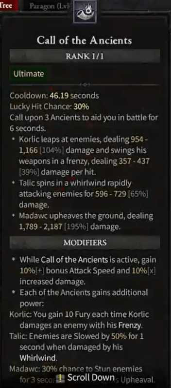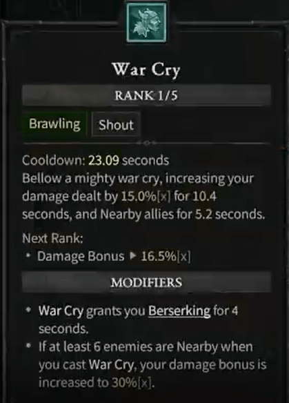 Nous ajoutons à cela le modificateur qui vous donne la capacité Berzerker pendant 4 secondes. Si vous avez au moins 6 ennemis à proximité lorsque vous lancez le Cri de Guerre, alors le bonus de dégâts est augmenté de 30%.