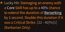 Ce "Coup de chance" est une compétence très intéressante qui aura un très bon scaling en end game, grâce à votre taux de critique qui devrait augmenter, augmentant ainsi vos temps de Berzerker et donc vos dégâts.