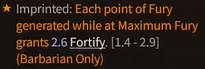 C'est un très bon légendaire qui va augmenter votre survie en vous donnant de la fortification. Quand vous êtes à fond en fureur, vous allez générer de la fortification, ce qui est très intéressant car le point faible du Barbare sur la bêta était sa survie.