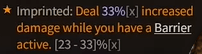 Ce légendaire vous donne des dégâts supplémentaires lorsque vous avez une barrière active. Pour le moment, l'intérêt est limité, mais en avançant dans le jeu, vous aurez sûrement plus d'opportunités de générer des barrières et donc d'utiliser ce légendaire.
