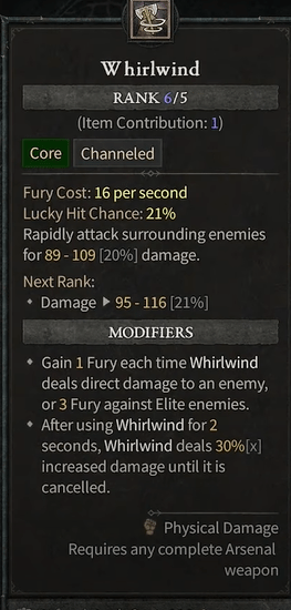 le tourbillon (Whirlwind) est culte dans Diablo 4 ! Mais dans cette version ses dégats de base sont un peu faible, avec seulement 20 % des dégâts de l'arme et des modificateurs pas très impressionnants. Cependant, ce qui est vraiment intéressant, c'est que, comme il s'agit d'une compétence canalisée, vous pouvez appliquer de nombreux bonus aux dégâts de l'arme qui dureront pendant toute la durée du tourbillon ce qui peut le rendre à terme dévastateur ! Nous allons aujourd'hui parler du build présenté par NickTew !