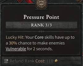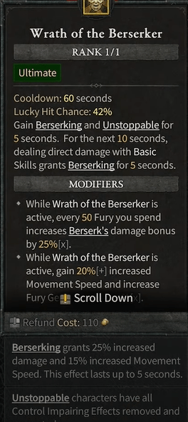 Ce "Coup de chance" est une compétence très intéressante qui aura un très bon scaling en end game, grâce à votre taux de critique qui devrait augmenter, augmentant ainsi vos temps de Berzerker et donc vos dégâts.