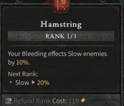Il est également précisé que le talent "Brise-genoux" est très intéressant car, étant donné que vous allez appliquer des effets de saignement via votre tourbillon et votre épée à deux mains, le simple fait de ralentir les cibles de 10% vous permet de bénéficier de l'affixe "Augmentation des dégâts contre les cibles qui subissent des effets de contrôle des foules". Cela vous permettra de bénéficier d'un bonus de dégâts supplémentaires de +20%.