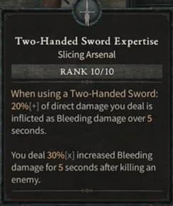 Comme vous pouvez le voir dans votre description d'expertise, les armes à deux mains vont automatiquement créer un effet de saignement, ce qui est très intéressant, car avec un seul point de talent dans "Brise-genoux (Harmstring)", vous pouvez gagner énormément de dégâts.