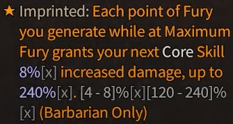 Également disponible sur les armes, pour chaque point de fureur généré lorsque vous êtes déjà au maximum de votre fureur, votre prochaine attaque principale verra ses dégâts augmenter, jusqu'à un maximum de 240%