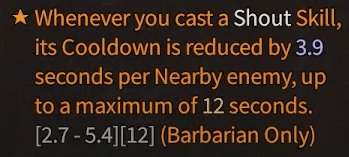 Nous ajoutons à cela le modificateur qui vous donne la capacité Berzerker pendant 4 secondes. Si vous avez au moins 6 ennemis à proximité lorsque vous lancez le Cri de Guerre, alors le bonus de dégâts est augmenté de 30%.