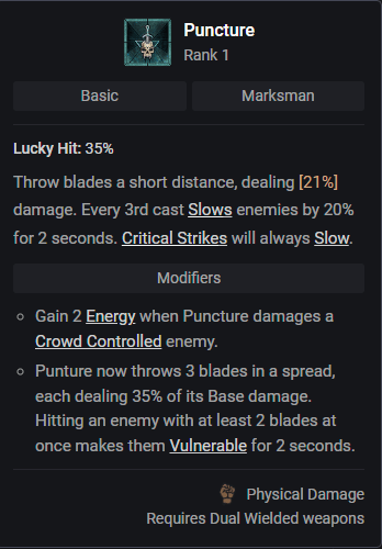 En attaque de base, nous allons jouer avec "Puncture" qui a la particularité de ralentir les ennemis toutes les 3 attaques. De plus, lorsqu'elle réalise un coup critique, elle sera une bonne source de récupération d'énergie et pourra rendre vos cibles vulnérables grâce au bon passif !