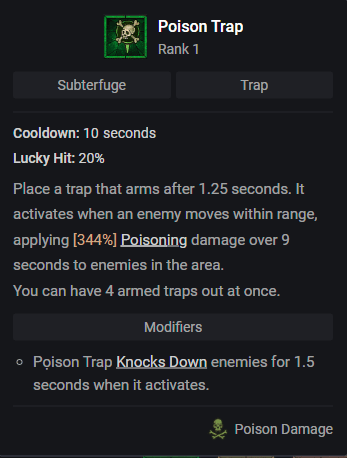 Un piège qui sera une très grosse source de dps, surtout contre vos grosses cibles. Vous pourrez pratiquement maintenir le poison en permanence dès le début du jeu !