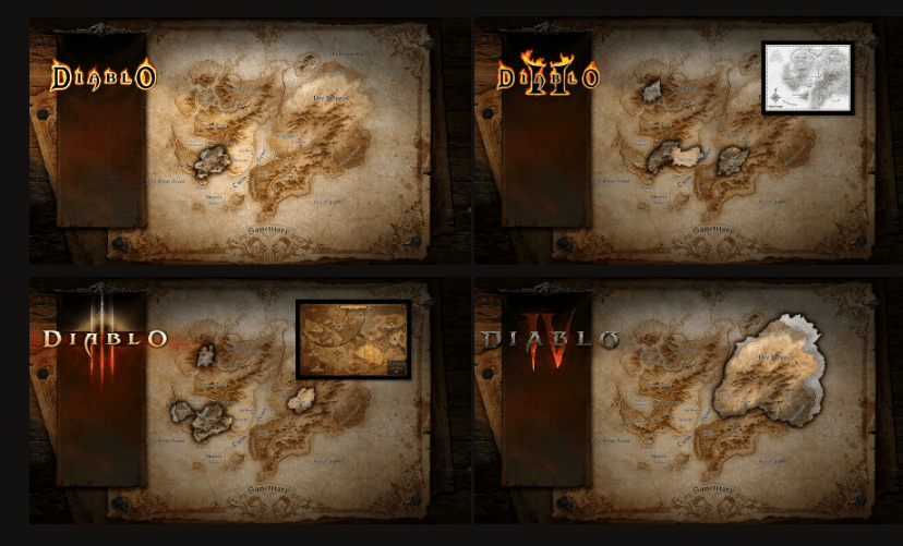 Selon de nombreuses cartes de Sanctuary et des superpositions de la carte de Diablo 4, il semble que nous n'ayons vu qu'environ un tiers du monde entier de Diablo. Cela n'inclut pas non plus les océans ou les zones d'autres royaumes, tels que les Hautes Cieux, les Enfers Ardents, ou le Pandémonium.