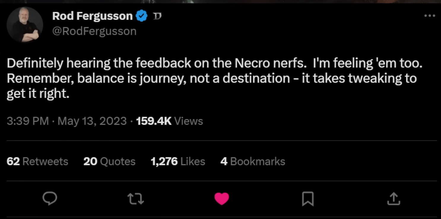 Rod Fergusson a précisé qu'ils avaient bien pris en compte les retours des joueurs concernant le nerf du nécromancien et que l'équilibrage des classes était toujours en cours, donc pas d'inquiétude.