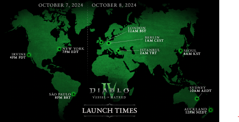 Dans un récemment publié Bluepost, Blizzard a partagé toutes les informations nécessaires concernant l’extension à venir de Diablo 4, Vessel of Hatred. Le post inclut également les horaires précis de lancement dans le monde entier – consultez la liste ci-dessous pour savoir quand Vessel of Hatred sera disponible dans votre fuseau horaire, y compris Paris !