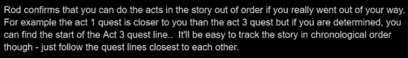 Rod confirme que vous pouvez faire les différents actes de l'histoire dans un ordre différent si vous le voulez vraiment, par exemple la quête de l'acte 1 est plus proche de celle de l'acte 3 mais si vous êtes déterminé, vous pouvez trouver le départ de la quête de l'acte 3. Cela sera néanmoins plus facile de suivre l'histoire dans le bon ordre chronologique, et de simplement suivre les quêtes dans l'ordre.