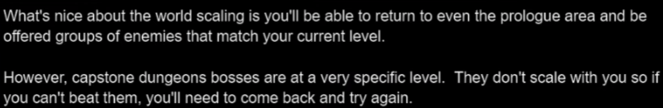 Ce qui est sympa à propos de l'équilibrage automatique du monde, c'est que vous allez être capable de revenir dans la zone du prologue et avoir des ennemis qui sont à votre niveau, par contre certains donjon commes le Donjon "Capstone" qui vous permet de passer en mode cauchemar sera à un niveau de difficulté bien spécifique, les mob ne vont pas s’adapter à vous, si vous ne pouvez pas les battre ,il faudra revenir et essayer à nouveau.