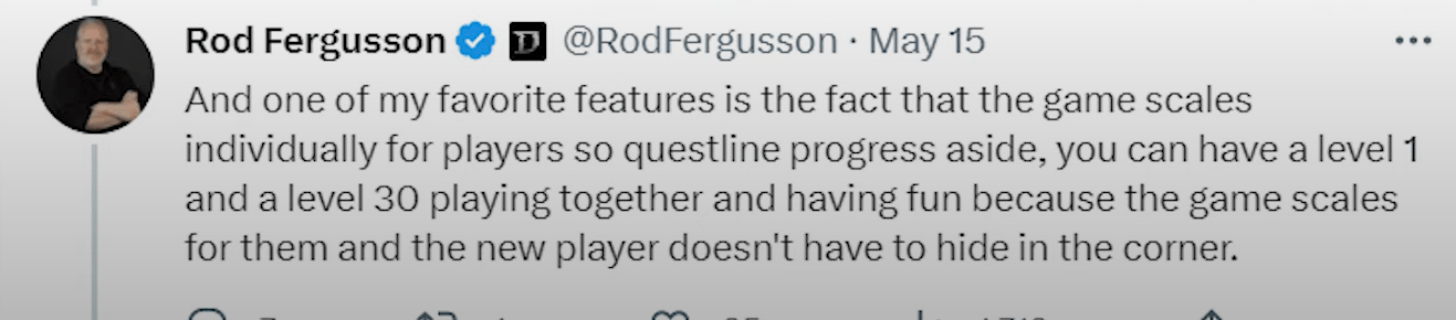 Ma fonctionnalité préférée c'est que le jeux scale de manière individuelle pour les joueurs, donc vous pouvez avoir un level 1 avec un level 30 qui joue ensemble et s'amuse, car le jeu s'équilibre pour eux, et les nouveaux joueurs n'ont pas besoin de se cacher dans un coin.
