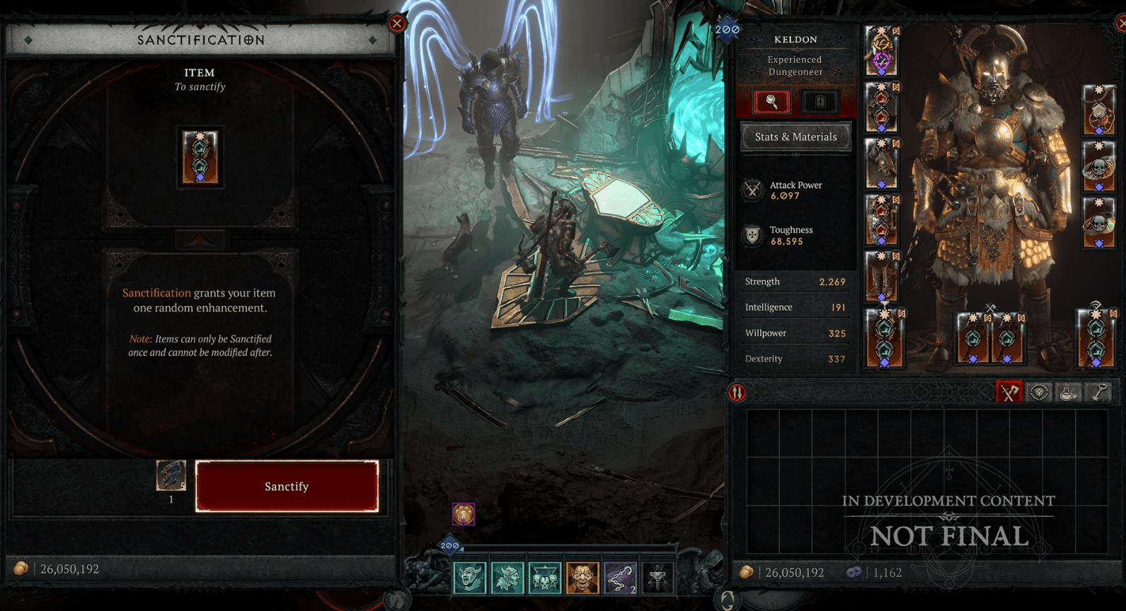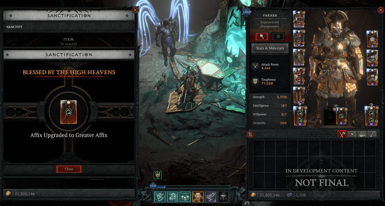 - Dans les niveaux de difficulté pré-Tourment, après avoir vaincu un Démon Mineur dans l’un des modes de jeu qu’ils ont envahis (comme la Vague Infernale), vous aurez une chance rare de sanctifier un objet à l’Enclume Céleste. Si vous choisissez de ne pas utiliser cette opportunité au moment de l’invitation, vous n’aurez plus la possibilité de Sanctifier votre objet jusqu’à ce que vous receviez une autre invitation divine.