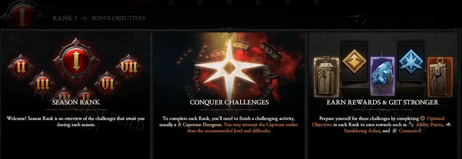 - Retour des Donjons Pinaculaires (Capstones) : Ils servent de verrous pour passer les rangs 1 à 5. Vous pouvez ignorer les petits objectifs et foncer sur le Capstone pour progresser, ou compléter les objectifs intermédiaires pour des récompenses bonus.