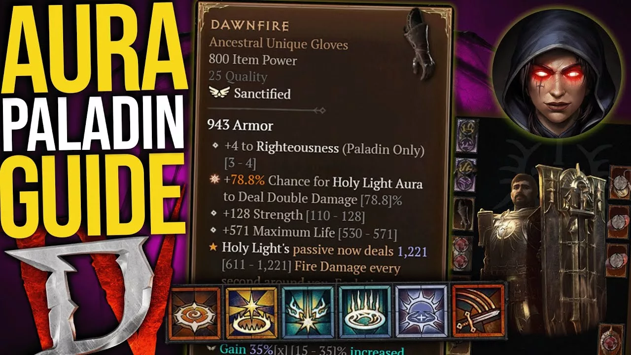 Aura de lumière sacrée, votre aura de feu inflige des degats massifs a tous les ennemis a l'ecran — un hommage direct au legendaire Dream Paladin de Diablo 2.