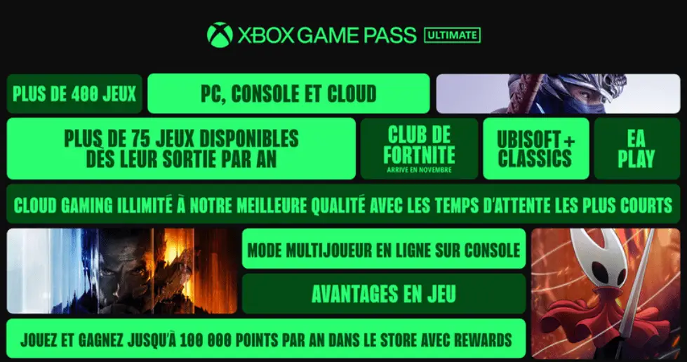 Game Pass Ultimate | 17,99€ | 26,99€ | + Ubisoft+ Classics, + Club de Fortnite, >75 jeux Day One, Cloud Gaming amélioré |