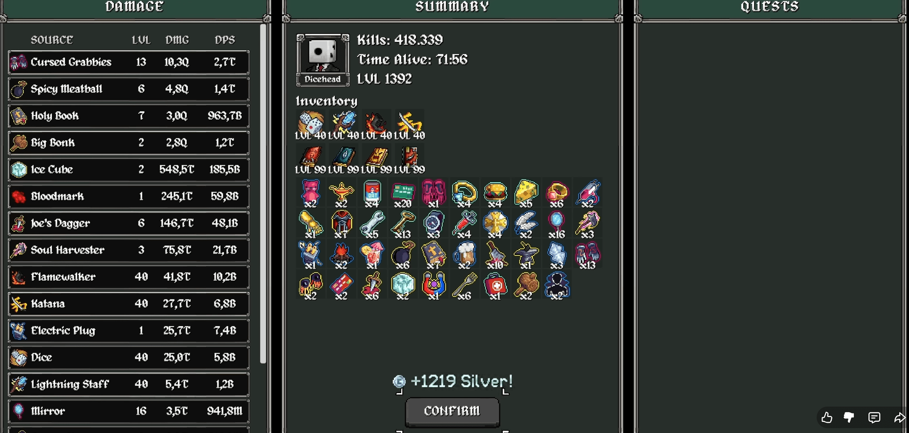 - Fin de Partie : Le Trône du Glitch Le but est de survivre le plus longtemps possible dans les vagues infinies post-boss. Et c’est là qu’intervient la mécanique avancée. Dans la run de référence, le joueur s’est retrouvé coincé dans le décor de la dernière carte. Loin d’être une fin, ce fut une révélation. L’immobilité forcée a activé en permanence le bonus de +100% de dégâts des Jus de l’Oisiveté (Idle Shoes), transformant Dicehead en une tourelle de destruction invincible qui a pulvérisé le compteur de kills.