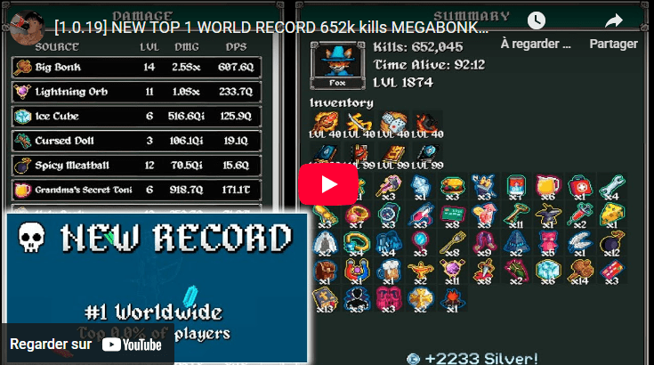 - Fin de Partie : Le build est maintenant autonome. Votre rôle est de vous positionner de manière optimale et de laisser la synergie des objets anéantir des vagues infinies. Le run record a utilisé une technique consistant à se placer près des piliers ou des coffres pour se protéger et laisser des objets comme le Livre Sacré nettoyer l’écran. La génération passive de dégâts est si élevée que le jeu devient presque un idle game.