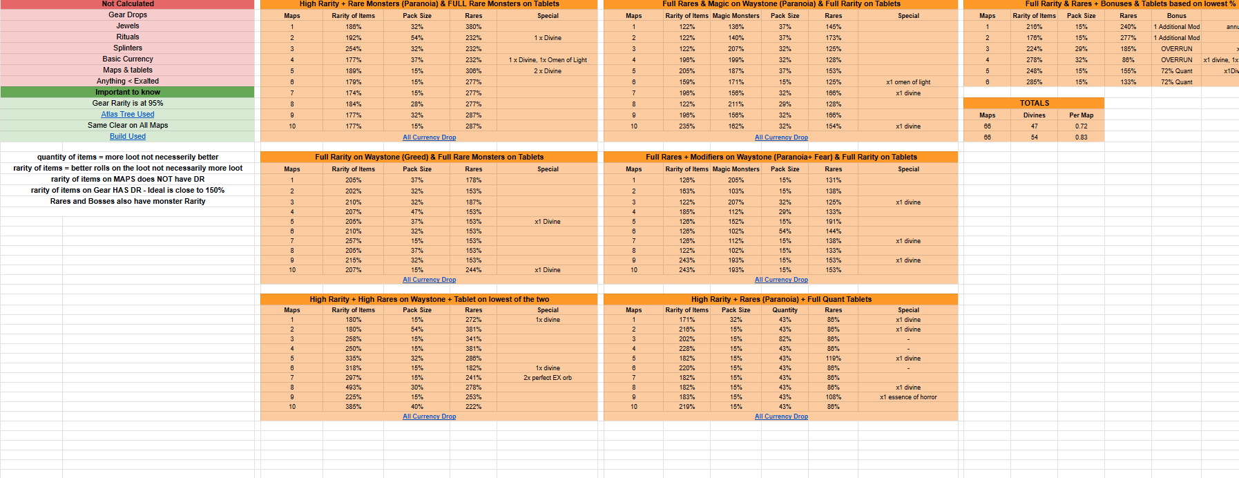 - L’objectif est de combler les manques. Si la Waystone donne beaucoup de rareté, utilisez des tablettes qui ajoutent des monstres rares (ex: 2 tablettes de Brèche (Breach) avec +38% de Rares chacune). Si elle donne beaucoup de Rares, utilisez des tablettes de Rareté.