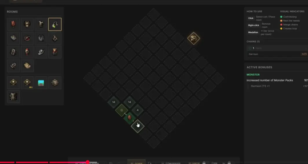 Le trick ? Vous placez une Armory sur le côté, puis une nouvelle Garrison, puis un Spy Master. Le jeu pense que vous démarrez une nouvelle chaîne. Sauf que cette nouvelle Garrison se connecte à l’ancienne. Vous verrouillez le Spy Master, les deux salles temporaires sont détruites, et vous vous retrouvez avec… Garrison → Spy Master → Garrison, prêt pour le prochain cycle.