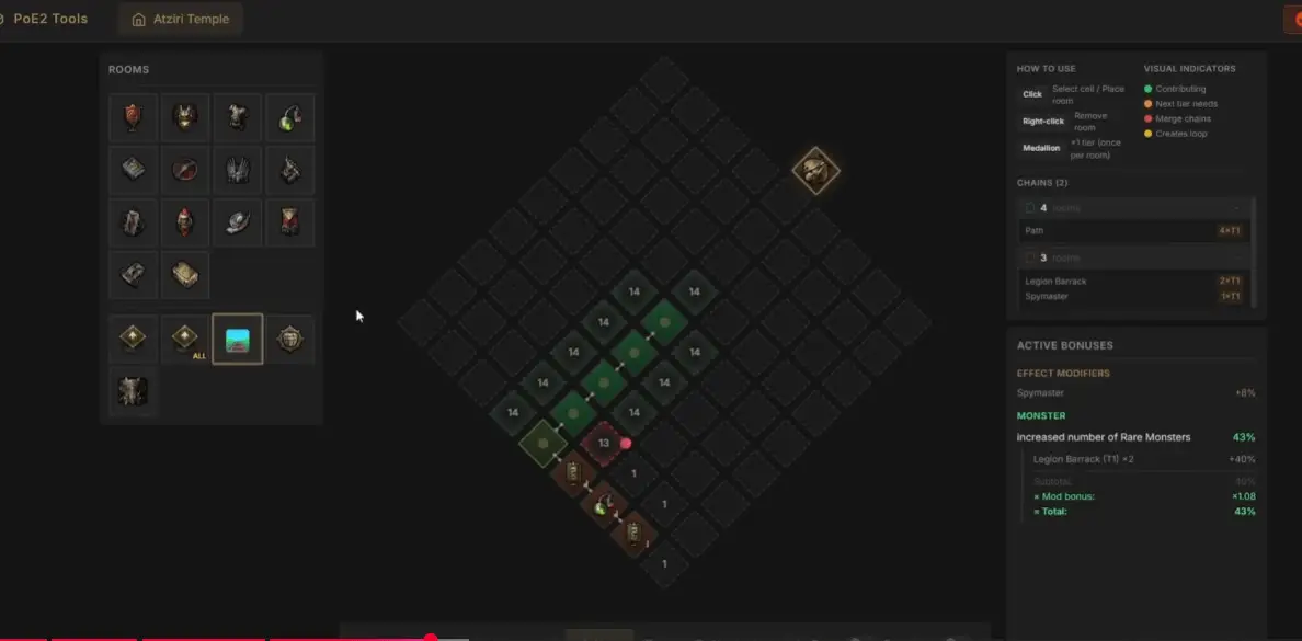 Pour planifier votre temple, utilisez l’éditeur gratuit : tetriszocker.github.io/atziri-temple-editor. Vous pouvez simuler différentes configurations avant de les construire en jeu. Il existe aussi un cheat sheet populaire sur Imgur pour référence rapide.