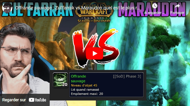 Maraudon est plus performant en ce qui concerne le farm d’offrandes sauvage, bien que je vous conseille fortement d’avoir un démoniste afin de téléporter plus facilement les joueurs à l’instance, et d’être bien groupés sur les sorties et entrées d’instance car le PvP est bien plus courant dans la zone.