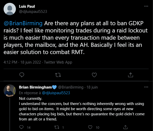 La question est assez amusante car Brian Birnnghamn lors d’une interview à avoué participer lui-même au raid GDKP et qu’il trouvait ça amusant (voir vidéo ci-dessous)