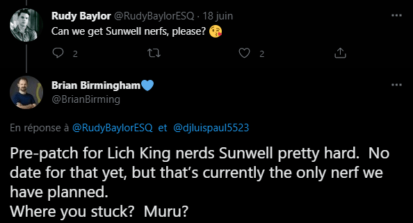 Brian Birninghamn, nous à posté quelques tweets cette semaine en réponse à des demandes de joueurs concernant un nerf éventuel de Sunwell et de bannir les raid GDKP pour WOTLK Classic.