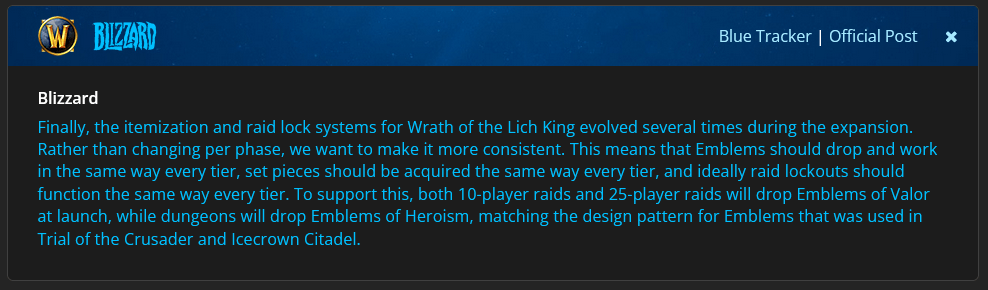 Les systèmes d’objet et de verrouillage des raids de Wrath of the Lich King ont évolué à plusieurs reprises au fil de l’extension. Plutôt que de les changer à chaque phase, nous voulions assurer une cohérence. Ça veut dire qu’à chaque niveau, les emblèmes tomberont et fonctionneront de la même manière, les pièces d’équipement s’obtiendront de la même manière, et idéalement, le système de verrouillage des raids sera le même. Pour cela, les raids à 10 comme à 25 personnes donneront des emblèmes de vaillance au lancement, tandis que les donjons donneront des emblèmes d’héroïsme, suivant ainsi le schéma des emblèmes utilisé dans l’épreuve du croisé et la citadelle de la Couronne de glace.