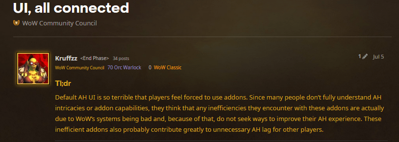 - L’interface utilisateur de l’hôtel des ventes est tellement horrible que les joueurs sont obligés d’utiliser des addons pour pouvoir l’utiliser correctement.