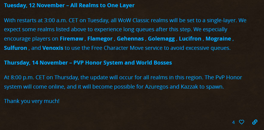 Nous encourageons particulièrement les joueurs de Firemaw, Flamegor, Gehennas, Golemagg, Lucifron, Mograine, Sulfuron et Venoxis à utiliser le service Free Character Move pour éviter les files d’attente excessives.