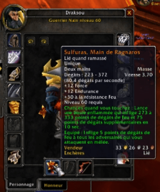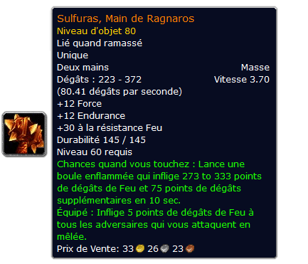 C’est fait ! ROAR à craft hier soir à 22h05 heure d’Ironforge la fameuse [Sulfuras, Main de Ragnaros] !